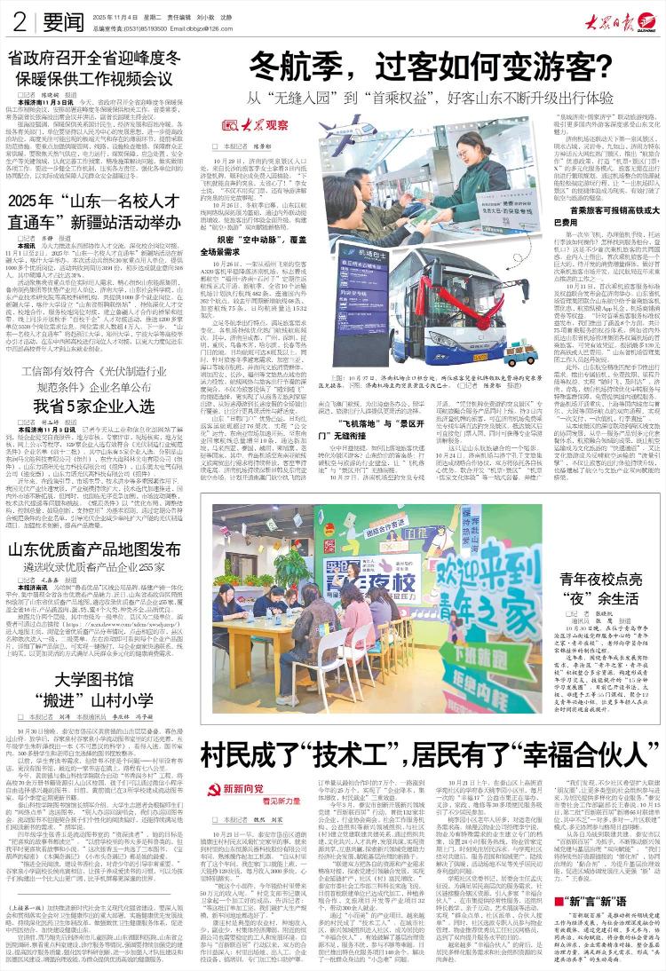 上图:10月27日,在济南机场出发柜台,两名旅客随登机牌领取了前往宝通春景区的免费旅游券。下图:济南机场到包头泉风景区的专车。 (□记者陈靖宇)□本报记者陈靖宇10月29日,在济南市包头春风景区门口,来自长沙的旅客李先生领取了三天内抵达济南的登机牌,并顺利完成免费入园检查。 “我觉得很安全,因为一下飞机就可以去包头温泉!”李先生说:“不但不用买票,还有导游,会讲解包头泉的历史。”冬季航空季于10月26日开始,在航线网络深度拓展的基础上,山东省通过内外部合作,全面提升旅客出行体验,提质增效,构建“航空+旅游”双向赋能新格局。编织一条满足全场景需求的密集“空中动脉” 10月26日,一架从福州起飞的空客A320客机安全降落在济南机场,正式开通成都航空“福州-济南-石河子”定期往返航线。在新的航空季,该州10个运输机场计划运营482条航线,连接262个国内和国际目的地。与去年同期相比,新增航线68条,加密航线75条,日均航班量1532架次。根据冬季出行特点,针对旅客需求变化,机场不断优化热门航线班次。其中,济南飞往成都、广州、深圳、昆明、重庆、乌鲁木齐、哈尔滨、长春等热门目的地的航班平均每天超过8班。同时,还将增加增加飞往三亚、海口等城市的航班数量,满足旅客冬季避寒的需求,扩大西安、长沙、福州等文化旅游热门城市针对文化旅游消费群体的运力。与航线网络和旅客出行节奏紧密结合,不仅为旅客提供了“随处飞”的便捷选择,而且覆盖了从商务出行到家庭出行、短途出行到长途度假的所有出行场景,让出行更加灵活便捷。山东省的“日韩门户”每天客运航班超过76架次,成为“中转目的地”。它具有执行“简单”操作的卓越优点。公司进军东南亚市场步伐加快,新加坡、马来西亚、泰国、越南、柬埔寨、老挝等东南亚国家航线数量不断增加总数减少到10个。其中,青岛机场至东南亚航线的文化旅游、商务出行需求将持续增加,客座率有望持续提升。济南机场持续深耕日本、韩国及东南亚航空市场,计划开通由澳门航空承运的济南至澳门直飞航班,为商务办公、留学及休闲旅客提供更灵活的选择。 “飞机降落”和“开放景点”完美衔接。空气变得越来越方便。如何快速将落地旅客转化为景区游客?山东省给出的回应是,打破航空与旅游的产业壁垒,将“飞机起降”与“景区开放”完美衔接。 10月27日,开通济南机场至包头温泉专线,同时推出综合性航空旅行服务产品,推出“凭登机牌免费畅游包头温泉”。 3天内抵达济南的旅客凭登机牌可乘坐济南机场直达包头温泉风景区的免费专线巴士。进入到达景区后,可以直接免费入园,还可以得到专业的导游服务。这只是山航与旅行社诚信合作的一个缩影。 10月24日,济南机场与济宁孔子文化旅游集团签署战略合作协议。双方将发挥各自核心优势,共同开发“机票+景区”、“机票+孔子文化体验”等一站式套餐,推广“春城济南+孔子济宁”联合旅游线路,吸引更多国内外游客深度体验山东文化魅力。济南机场还与全球第一的春季SC合作名胜区、明水古镇、灵岩寺、九巫山、济南特色东方神话等5个网红热门景区推出优惠“航空旅游合作”政策,构建多元化“伯乐”服务模式。 机票+景区门票+寄存行李?如何找到服务台和登机口?这是很多首次旅客的共同困惑点。业内人士指出,首次旅客是一个巨大的未开发的额外消费群体,开拓首次旅客市场是民航局近年来推动航班的重要工作之一。 10月11日,首届旅客服务标准与权益联合新闻发布会在济南举行。山东机场管理集团与山航合作,为旅客提供机票折扣、航旅纵横APP赠送、消费券等新权益在机场商店。山东省官员赵丹妮表示:“针对首飞旅客服务权益发放规范,我们推出了涵盖八个方面、共75项首飞服务的权益制度。例如,从省外到达山东省机场管理集团所属机场的首飞旅客,凭有效凭证,最高可退还120元高铁、公交费用。”机场管理集团。此外,山航还将推出专属值机、免费改签、里程升级等福利,精准满足季节性出行需求,实现“随时飞,准时到达”。济南机场、青岛机场、烟台机场不断优化中转服务,保障特殊群体旅客,开通免费直飞国内航班。青岛机场已开通至国内城市的双向航线重庆、上海以及首尔、大阪等海外目的地,实现“一次支付、一次值机、行李直送”。从各地景区的紧密配合,从单一的服务产品到多元化的套餐体系,再到各地区文化旅游的协同发展,航空与旅游国际化领域取得的成就,不仅让航空运输成为文化旅游的“快车道”,也让文化旅游成为供给航空运输的“交通引擎”。我们不仅持续提升旅客的出行体验,也为航空业与文旅业双向强强联手搭建起桥梁。