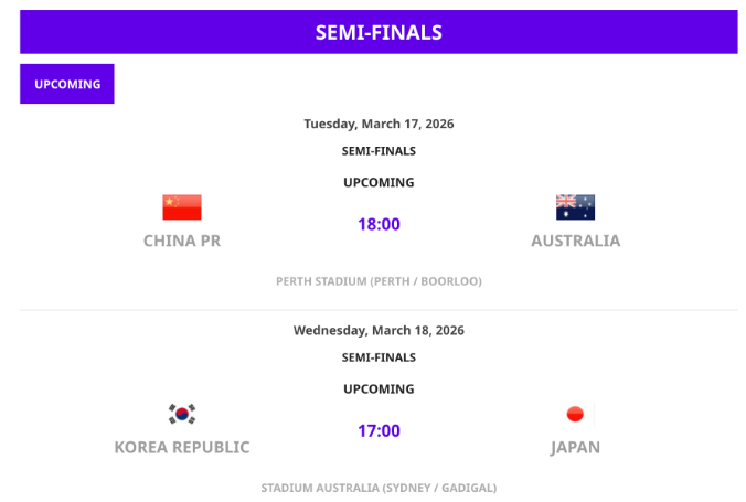 北京时间3月15日,2026年女足亚洲杯两场半决赛的比赛结果揭晓。此前以2比0击败中华台北女足的中国女足将于3月17日下午6点迎战东道主澳大利亚。北京时间。另一场半决赛将由韩国女足迎战日本女足。两场比赛的胜者将于3月21日进行决赛(央视体育)