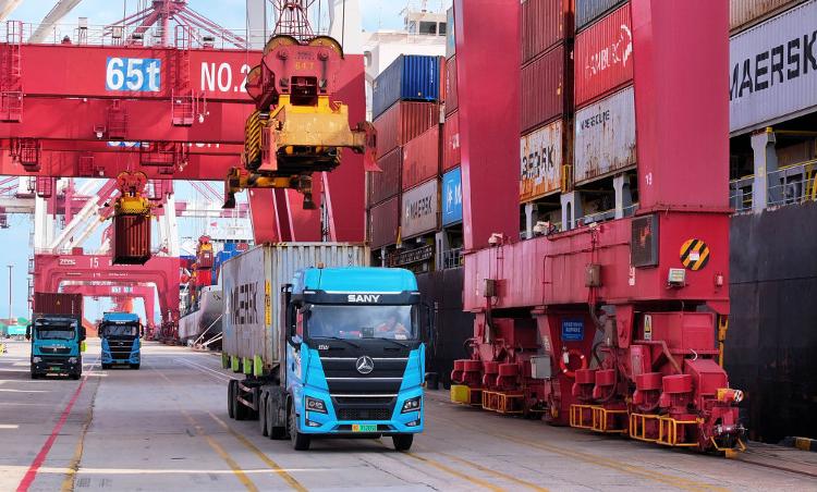 ^ 青岛港区一辆运输集装箱的货车(10月29日无人机拍摄)。近年来,山东港青岛港发挥毗邻日韩的区位优势和海上贸易往来基地优势,形成了覆盖日韩主要港口的细致的海上航线网络。目前,青岛港处理大量来自日本、韩国的国际货物,每周约有40艘直达“日韩快线”船舶投入运营,形成了中日韩之间高效、精准、便捷的海上物流通道。新华社记者 李志恒 摄 ↑ 这是青岛港繁华的前湾港区(10月29日无人机拍摄)。 ↑ 直达韩国仁川港的大型船舶“板青成”号(右)在青岛港前王港区正在装卸集装箱(d)10 月 29 日拍摄的照片)。 ^ 这是青岛港热闹的前王港区(10月29日无人机拍摄)。 ^ 青岛港繁华的前王港区(10月29日无人机拍摄)。 ^ 青岛港区一辆运输集装箱的货车(10月29日无人机拍摄)。 ↑ 一艘直达韩国仁川港的远洋客轮,在青岛港前港区装卸集装箱(10月29日无人机拍摄)。 ↑这是青岛港前王港区(10月29日无人机拍摄)。 ^ 直达韩国仁川港的大船“板青盛”号在浦青岛上空前王港区装卸集装箱(10月29日无人机拍摄)。 ↑ 直达韩国仁川港的大型船舶“班青盛号”在青岛港前王港区装卸集装箱(10月29日无人机拍摄)。 ↑ 一艘货船正在装卸集装箱青岛港前湾港区(10月29日无人机拍摄)。 ^ 青岛港繁华的前王港区(10月29日无人机拍摄)。 ↑ 一艘货船离开青岛港前王港区(10月29日无人机拍摄)。 ^ 这是青岛港热闹的前王港区(10月29日无人机拍摄)。 ^ 直达韩国仁川港的大型船舶“班青盛号”在青岛港前王港区装卸集装箱(12月29日无人机拍摄)。