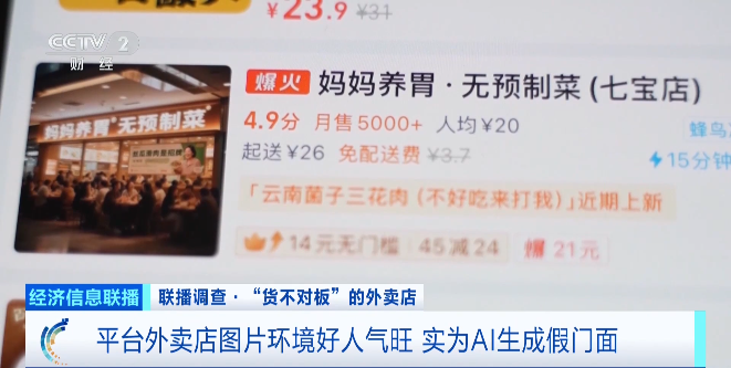 (《央视财经资讯联播》)订外卖已经成为很多消费者的日常,餐饮相关的安全问题也日益凸显。很多消费者都经历过外卖平台上的餐厅或线下商店的产品照片“杂乱”的情况。这张看上去烟火气十足的所谓“真人照片”,实际上是一家外卖公司利用人工智能技术生成的假照片。 “每月 5,000 个订单,4.9 评分,无预制商品。”记者在某外卖平台上找到了一家名为“妈妈养味”的外卖店。从网站上的照片来看,这家店的招牌很醒目,可以看到里面挤满了很多顾客。点击它还会显示一段视频,介绍厨房和店内外的气氛。当记者顺着站台指示前往上海市闵行区七莘路华商时代广场时,店铺就在眼前。g 找不到标记为 5 130 的街道。一位路过的外卖工作人员告诉记者,妈妈滋补小肚店不在一楼,而是在二楼大厅。在一条狭窄的巷子里,记者看到厨房门的一侧挂着“妈妈养肚”的红色牌子,另一侧则挂着“三鲜辣”的牌子。我们店只提供外卖,没有堂食空间。环境也和平台上“玛玛燕尾”、“闲三心”店的照片有很大不同。原来,这家厨房在平台上经营着“玛玛燕威”和“鲜三新”两家店铺。每家店都有不同的地址和rcials等牌照,月销量超过4000件。如果实际产品与照片不同,则此规定不适用。一家名为“清川广力神”的外卖专门店。从照片看,这家店的外观装修得很漂亮,但记者在现场发现,这似乎是隐藏在黄浦区一栋大楼的二楼区域,旁边还有一家外卖店。不仅没有明确的门牌号,过道上还堆满了食物和生活用品。此外,一些外卖卖家通过品牌介绍、视频等方式误导消费者。文字介绍中描述了这家名为“上海成都人”的外卖店。餐厅环境看起来不错,但实际上,就餐空间是与另一家外卖店共用的,而且没有人在清理地上的烟头。记者调查发现,人工智能生成门面的低成本使得打造“虚拟门面”成为一些外卖商的“捷径”。在很多平台上,“AI生成店面照片”的服务费都在几十元左右。商家声称,他们只需提供商店名称,就可以用商店名称的虚拟场景个性化照片。通过输入“餐厅店面”、“烟花”等关键词进入AI软件,可以在几秒钟内免费生成一张精美的商店地图。